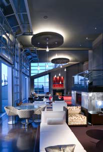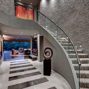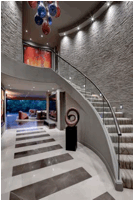 The modern design of Everett’s Dallas home is dramatic and unconventional, featuring artwork, textiles and lighting all custom-designed for the space. Along with Vetro founder David Gappa, Hager co-designed a signature chandelier to be the focal point of the grand entryway. The hand blown glass droplets mimic the serenity of a rain shower and the amber, ruby and sapphire hues add a warm opulence. The décor unfolds in a seamless assemblage, every element bearing an architectural imperative.