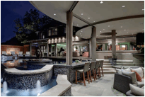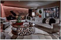 In addition to designing a chef’s kitchen, a contemporary home theater, a masculine master retreat and a luxurious and vibrant indoor/outdoor living space, Hager also personalized space for Everett’s daughter creating a pretty, feminine bedroom complete with a pink chandelier and separate play room with a tea table and ballet barre.