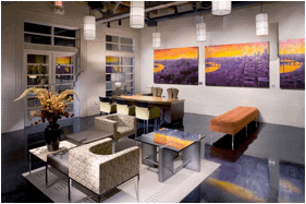 What started out years ago as one painting to solve the problem of a restrictive budget for a particular project has now grown into a proven system for producing high-impact multifamily environments. Geoff’s commissioned art helps to create exceptional experiences for both visitors and inhabitants, and people are pleased to be able to live in and afford such an environment. Combined with Stephanie’s interiors, lobbies look like galleries and museums. In fact, on the ICON project, Geoff plans on having a local installer place descriptive placards beside the pieces to enhance this very feeling.