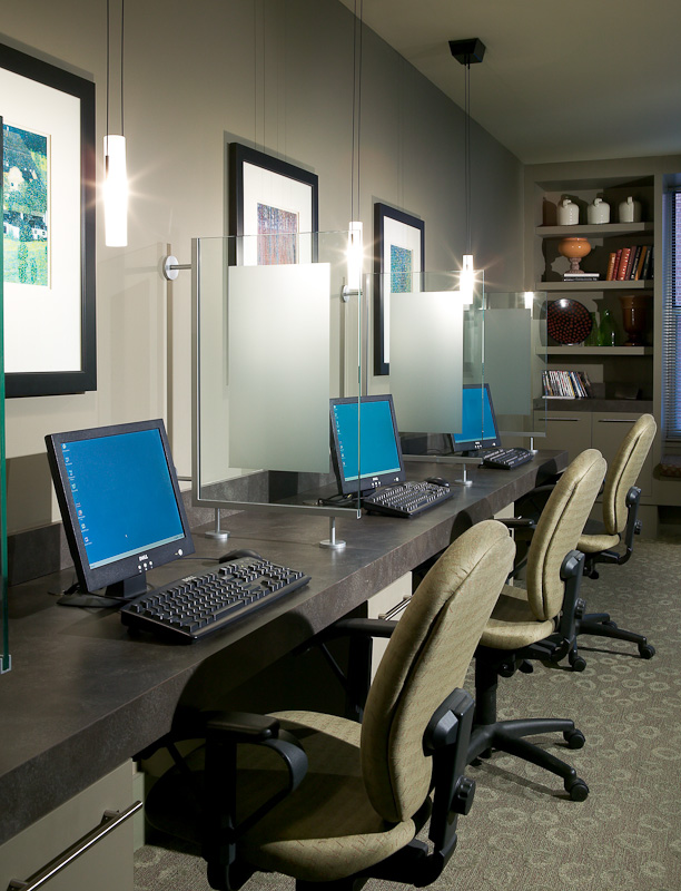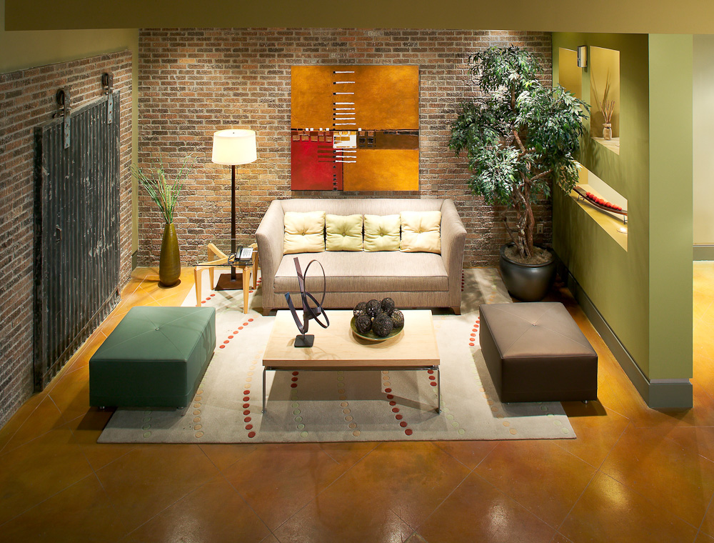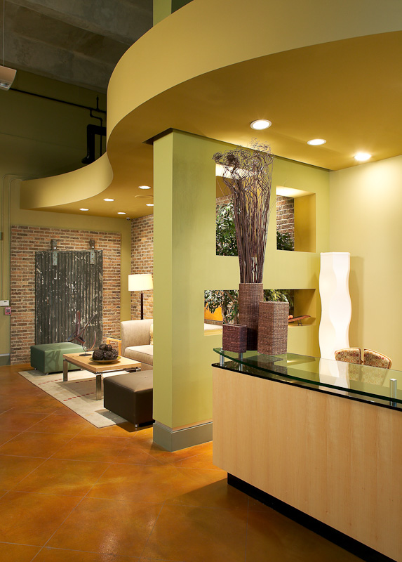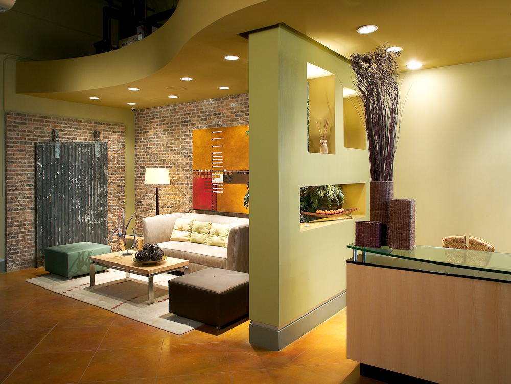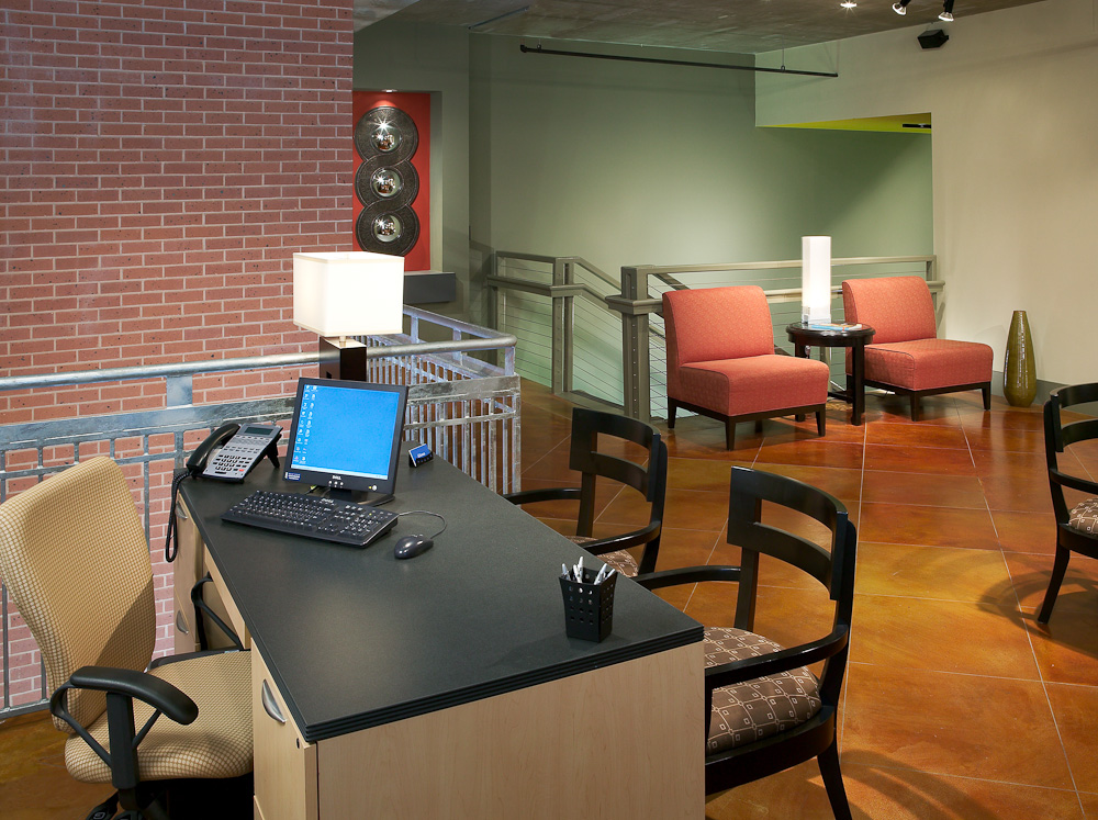 The entrance to AMLI Downtown is cutting edge, with a long reception area on the ground floor and the lobby on the second level. “This design accommodates a trend of using historic buildings as part of multifamily construction,” Stephanie Moore Hager said. “The lobby design tied in the historic warehouse that had been on the site with the current urban design.’”
