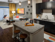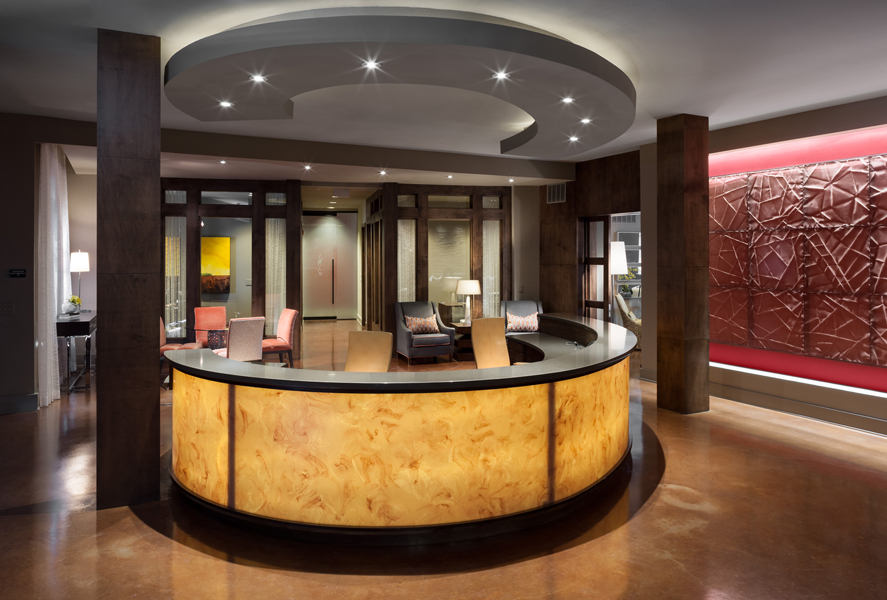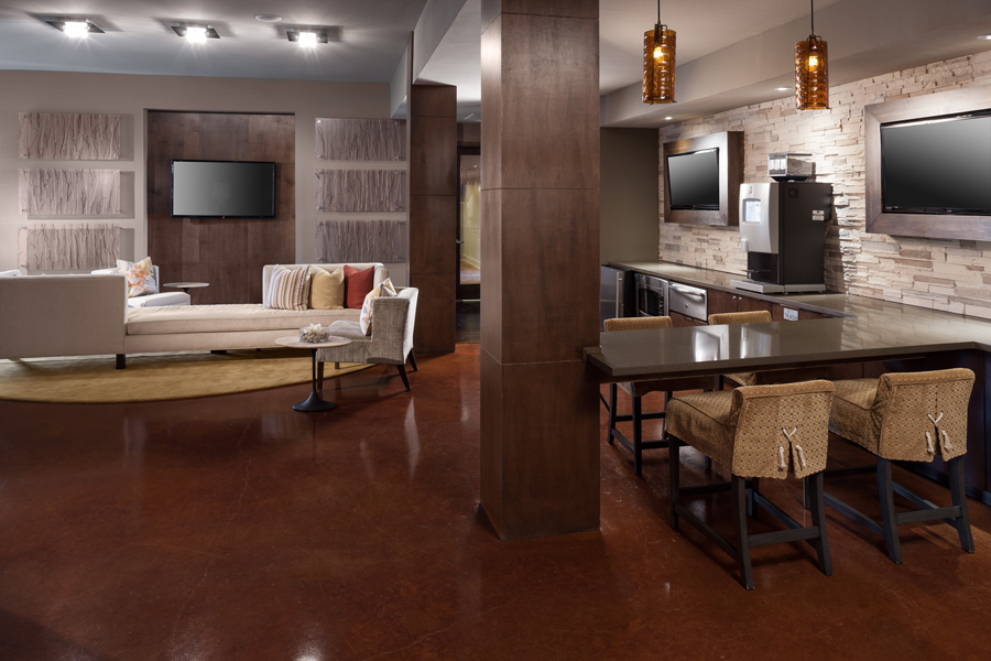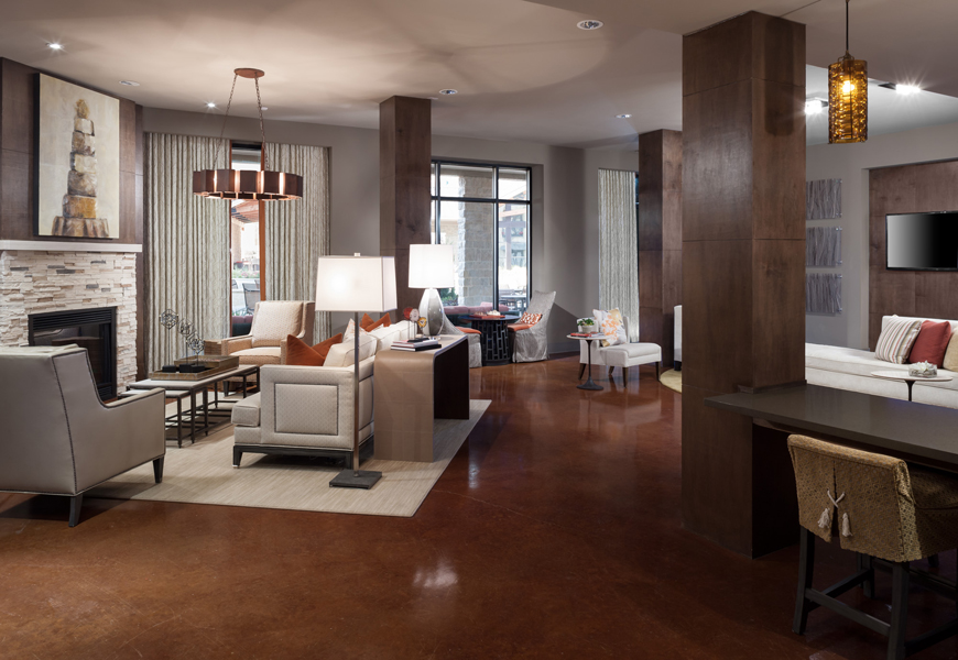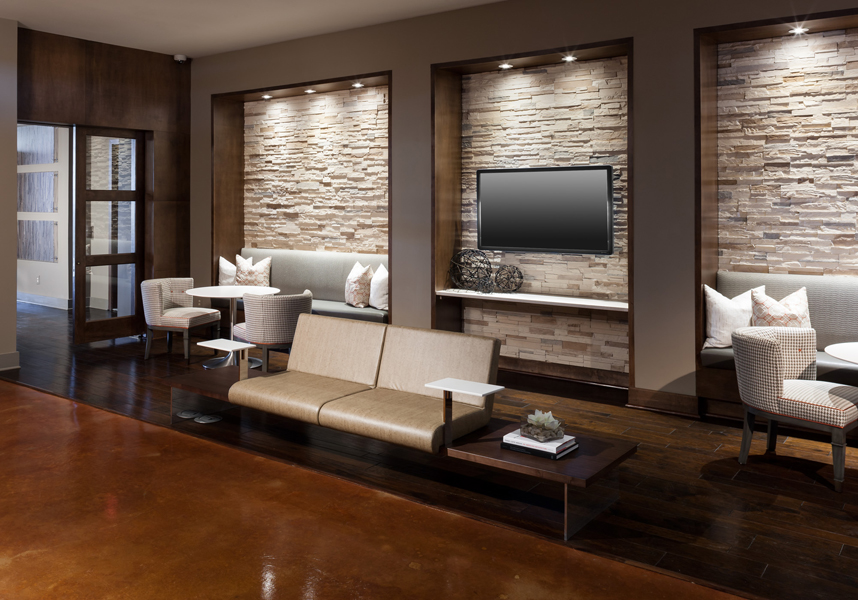 The sophisticated ambiance of a boutique hotel greets visitors upon entering the leasing office and amenity areas at SageStone. The concierge/leasing desk evokes an urban energy while a chic café/latte bar with multiple plasma screens defines the social space. MDG incorporated disparate elements of artwork, furnishings and finishes to create a functional and luxurious space.