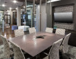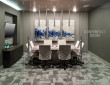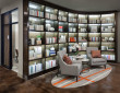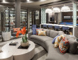 Clean modern rectangular lines that intersect with warm circular ceiling intrigue the eye to move in subtle motions to live a fast paced but relaxed environment.