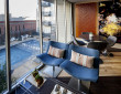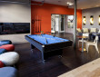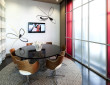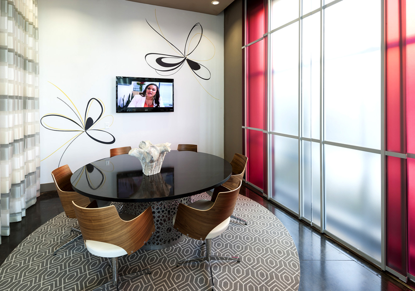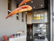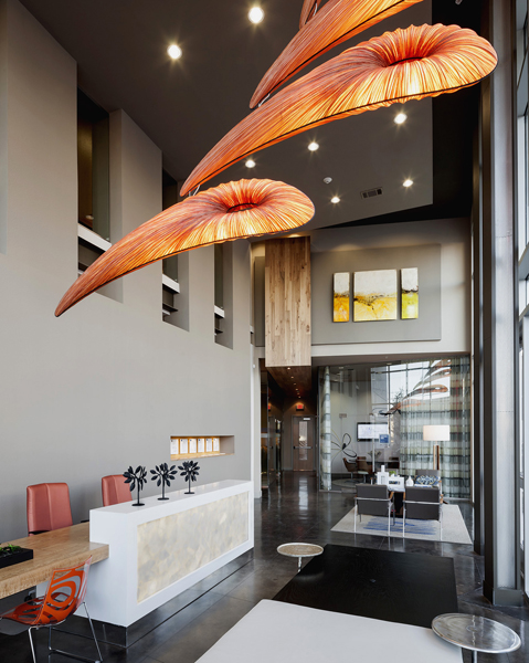 Meticulously designed with clean lines, warm tones and richly hued fabrics, Moore Design Group created a modern space filled with light that connects the property Lancaster to its vibrant surroundings. Sustainable woods, customized wall coverings and a commissioned conference table by a local artist complete the refined contemporary palette. The lobby features a unique sustainable lighting sculpture from Aqua Creations’ ‘Jewel Collection’ that adds intrigue and whimsy. The movement of the suspended kinetic mobiles creates an elegant, theatrical environment.