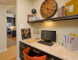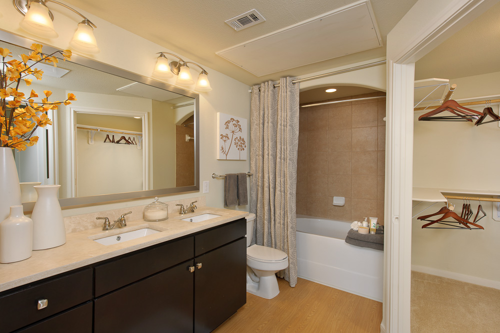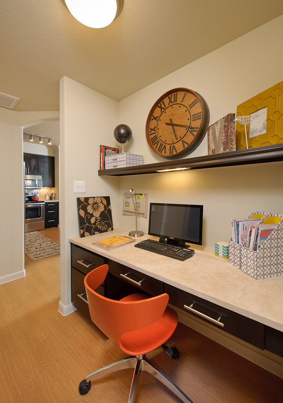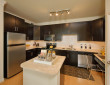 The unit interiors are in the style of a custom home – open spaces with wood-style flooring in the entries, kitchens and bathrooms. The living areas and bedrooms are carpeted. The kitchens boast travertine countertops, stainless steel appliances, tiled backsplashes, custom 42-inch cabinets, under mount kitchen sinks with designer faucets and kitchen islands with pendant lighting.